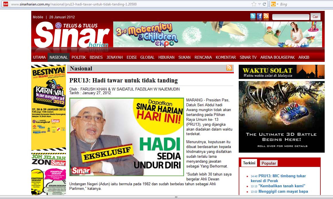I do not know how much power is wielded by the President, Hj Hadi Awang, who seems encircled by the Ataturks. Whether he still calls the shots in PAS, nobody really knows. Suddenly, I read in an online news that Hj Hadi offers himself to NOT be nominated to stand for the next General Elections.