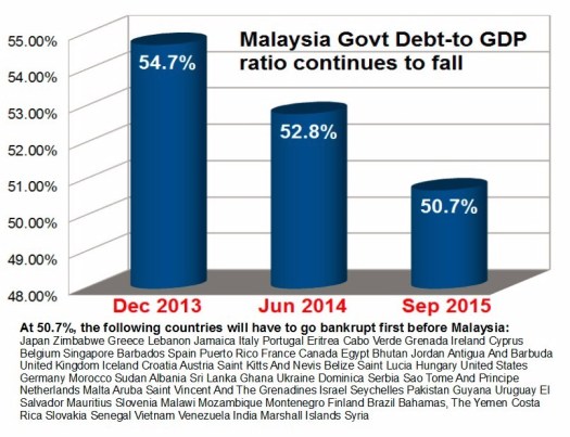 According to a parliament answer by Deputy Finance Minister Johari, as at end Sept 30, 2015 our govt debt is now at RM623.3 billion, which is 50.7% of GDP – dropping from 52.8% (RM568,8 billion at June 30, 2014) and 54.7% (RM547.6 billion as at end 2013).