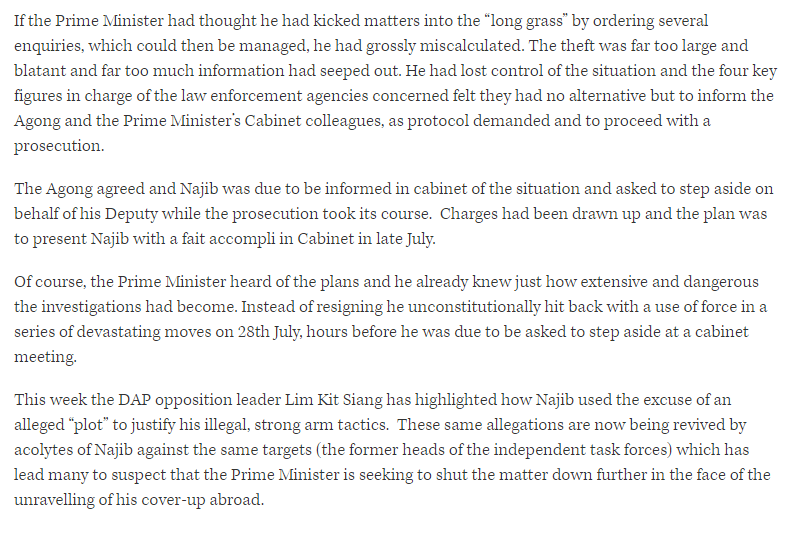Of course, according to the SR, the conspirators then had no choice but to bring the matters to His Majesty Yang DiPertuan Agong, and the Yang DiPertuan Agong agreed that Najib Razak should step down “while prosecution took its course.” Like I mentioned above, how was it possible for prosecution to proceed when Najib Razak himself had not been questioned on his involvement by the very agencies claimed by SR to have decided to prosecute? Furthermore, what Constitutional powers does the Yang DiPertuan Agong have to tell Najib Razak to step down? Even Lim Guan Eng, already investigated and charged in court on two counts of corruption, has not left office to let prosecution take its course!