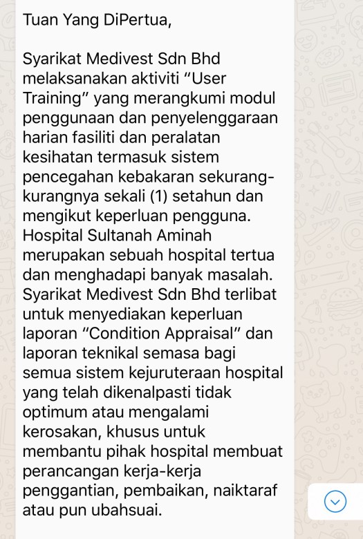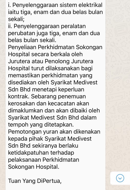 Word has it that between 2014 and 2016, no fire and evacuation drill nor fire-fighting training was ever conducted. The last drill and training that was recorded was in 2009! Therefore it is safe to say that the last Fire Certificate was obtained then! How is it possible that Medivest Sdn Bhd, a company that was given the 30-year concession to maintain the operational safety of our hospitals be allowed to do things against whatever safety laws and regulations that are there to protect lives and government properties? Are they not suppose to conduct at least one training per annum as briefed to the Dewan by the Minister?
