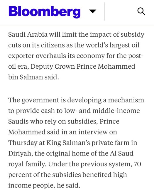 Arab Saudi juga telah mengambil langkah yang sama seperti Malaysia dengan menghapuskan subsidi dan memoerkenalkan skim bantuan kewangan bagi golongan berpendapatan rendah dan sederhana.