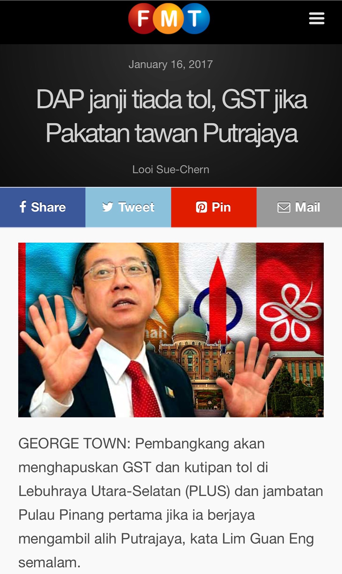 Sebagai contoh di atas, Ketua Menteri yang telah didakwa sebagai korup di dalam mahkamah berjanji bukan sahaja untuk menghapuskan GST yang telah banyak membantu negara semasa kemurungan ekonomi global malah menghapuskan kutipan tol Lebuhraya Utara-Selatan serta Jambatan Pulau Pinang Pertama.