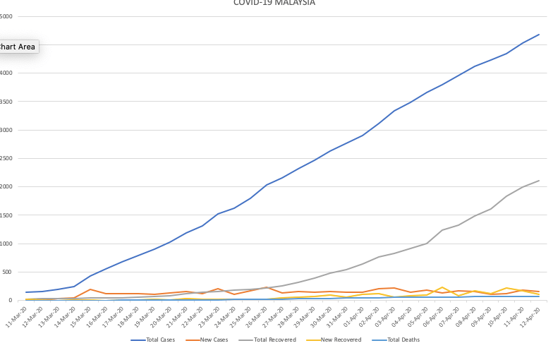 Graph showing COVID-19 total cases, daily cases, total recovered, daily recovered, and total deaths in Malaysia from 11 March 2020 till 12 April 2020