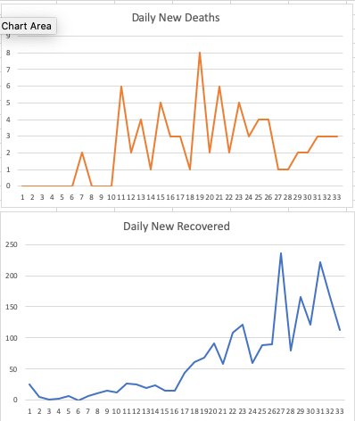 In the first graph, the blue line at the top represents total number of cases while the grey line beneath it represents total number of those who have recovered. Optimally, we should see the blue line tapering and flattening, the grey line showing exponential increase whilst decreasing the gap between the two. It is only when the blue line flattens and the grey line crosses it could be breathe a sigh of relief. Unfortunately, that hasn’t happened.