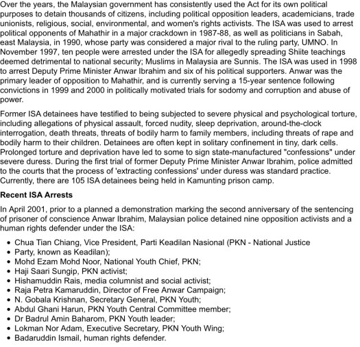 What Soros did was to try bring down old Mahathir whom during his premiership incarcerated his opponents without trial. In a Human Rights Watch reported dated some time in 2001, Mahathir was reported to have detained thousands without trial, and at the time of writing there were 105 ISA detainees in the Kamunting Detention Centre.