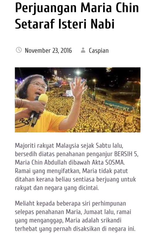 Maria Chin Abdullah tidak boleh disamakan taraf dengan Siti Khadijah R.A. Siti Khadijah tidak makan babi dan tidak mengumpul dana untuk menjatuhkan sebuah kerajaan sebuah negara yang mendokong Islam, yang dipimpin oleh seorang yang beragama Islam.