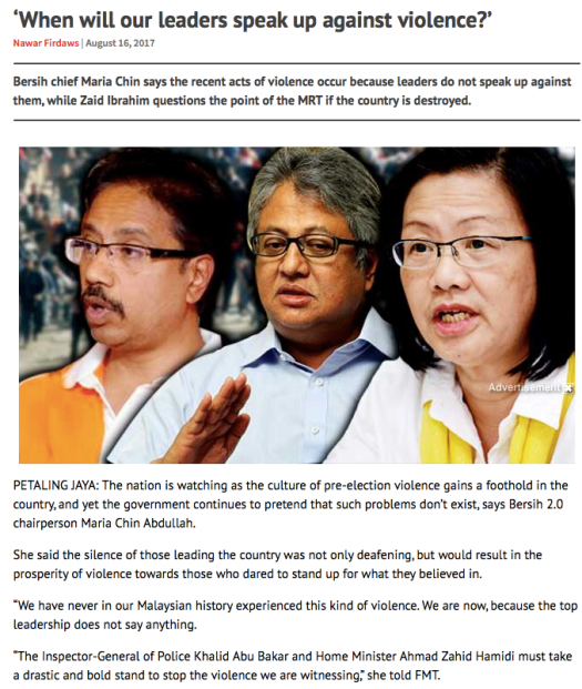 Maria China Abdullah, the Grand Ah-So of BERSIH, has spoken out against the silence of the country’s leaders on the recent political violence involving solely Parti Pemecah Belah Melayu (PPBM) members.