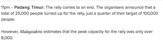 Despite lining up old dinosaurs like Emperor Lim Kit Siang and U-Turn Mahathir, Pakatan only got 8,000 attendees at the peak of the event according to a post by Malaysiakini made just after the event ended at 11pm that night.