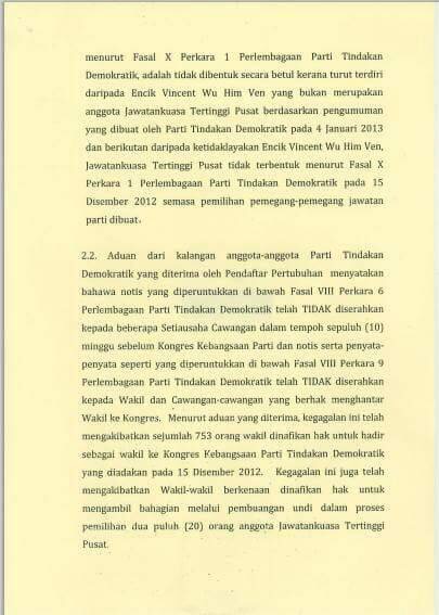 In Paragraph 2.2 it is also mentioned that members complained about not receiving the notice of meeting TEN weeks before the party’s national congress was held as required by Clause VIII Item 9 of the DAP constitution. This resulted in 753 delegates having their right to attend the congress denied by the party’s manahement, and denied their right to vote for the 20 CEC members.