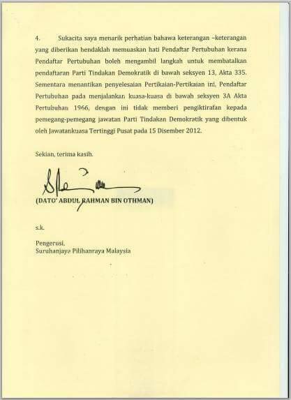 In the last paragraph, the DAP was given a stern reminder by the RoS to comply with all the requirements of the RoS which were based on the DAP’s own party constitution, failing which the RoS could take action to de-register the party as provided for via Section 13 of the Societies Act, 1966. In waiting for compliance, the RoS refused to recognise the legitimacy of the CEC formed after the 15 December 2012 national congress.