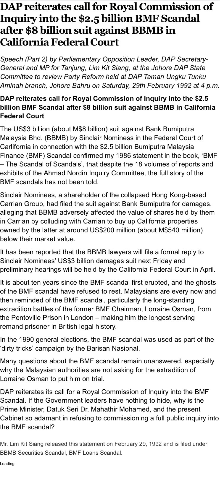 Like I said, Kit Siang is so proud of himself, his works, speeches etc., that he shares them all with us online. And there are about ten posts related to the BMF scandal itself.