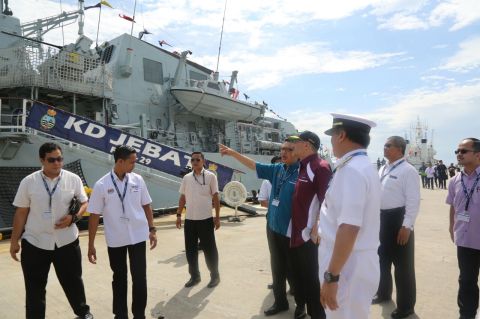 The Ministers of Defence and Transport viewing the preparations at the Maritime Segment before the Press Conference cum High Tea on board the Royal Malaysian Navy frigate KD Jebat