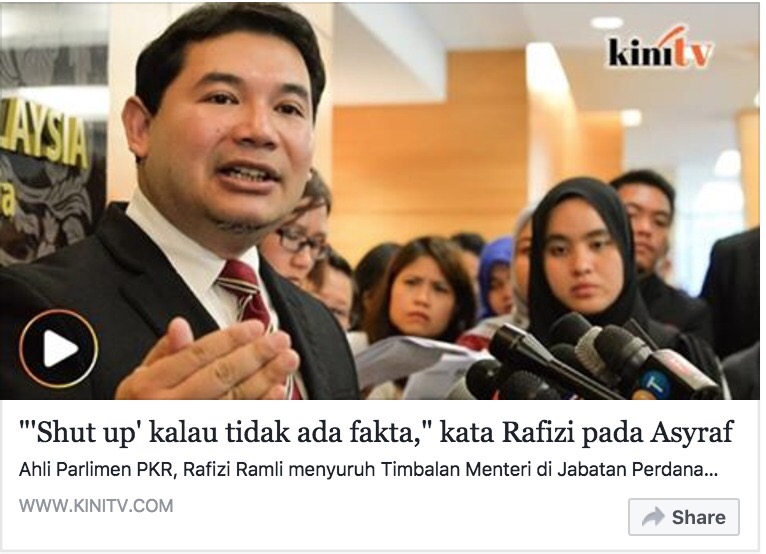 “Shut up if you don’t have the facts,” said PKR’s Rafizi Ramli to Deputy Minister in the Prime Minister’s Department Dr Asyraf Wajdi Dusuki on the latter’s claim that Tabung Haji (TH) has initiated a suit against him (Rafizi). In his Facebook Dr Asyraf has refused to debate with Rafizi on an issue involving TH saying that it isnow a legal issue between TH and Rafizi.