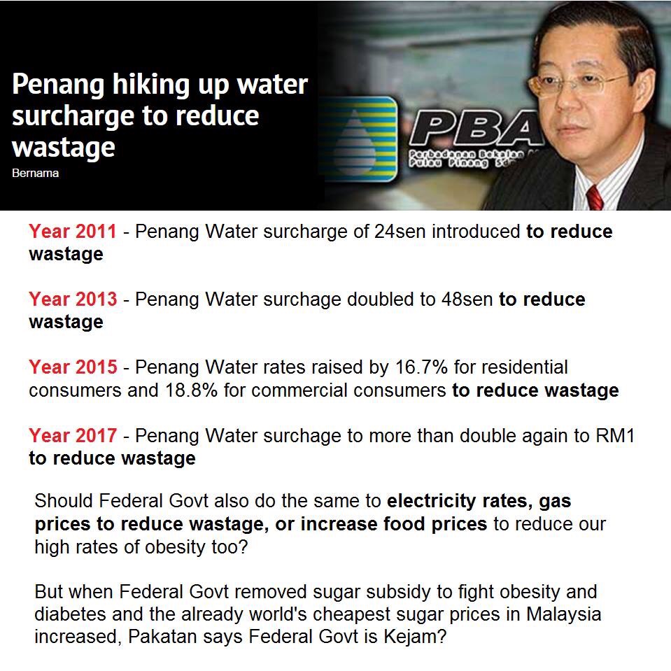 – 4 increases in water rates and surcharges in 9 years since 2008. DAP brags about this all the time claiming that due to good governance and CAT that Penang has never had any water rationing, Lowest NRW, lowest rates etc – exactly as the decades before DAP took power.
