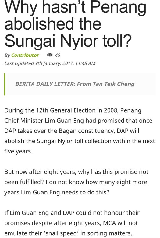 These are all ways initiated by the government to make connectivity better and cost of living lesser for the people of the Klang Valley. At least, no false promises such as abolishing tolls have been made, such as the one made by the DAP-led state government in 2007 which have not only gone unfulfilled, but also reneged on by introducing not only tolls for Pulau Pinang voters to shoulder, but also having to foot higher parking charges statewide.