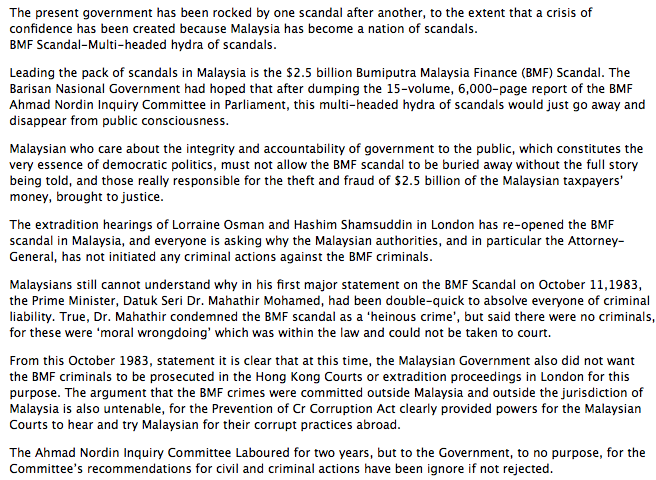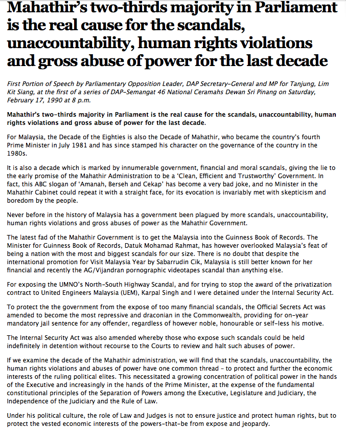 “If we examine the decade of the Mahathir administration, we will find that the scandals, unaccountability, the human rights violations and abuses of power have one common thread – to protect and further the economic interests of the ruling political elites. This necessitated a growing concentration of political power in the hands of the Executive and increasingly in the hands of the Prime Minister, at the expense of the fundamental constitutional principles of the Separation of Powers among the Executive, Legislature and Judiciary, the Independence of the Judiciary and the Rule of Law.