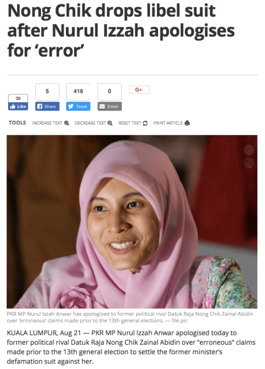 And Nurul Izzah who went on a smear campaign against her opponent Raja Nong Chik which led to her victory against the very popular man decided to settle the case out of court and issued an apology to Raja Nong Chik.