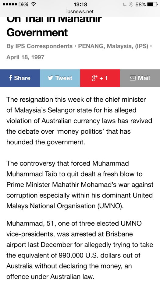 Kejadian pertama pada tahun 1997 melibatkan Menteri Besar Selangor ketika itu iaitu Tan Sri Muhammad bin Mohd Taib. Muhammad yang sebelum itu mempunyai satu lagi skandal iaitu berkahwin lari bersama Tengku Zahariah binti Tengku Abdul Aziz Shah di Takbai, Selatan Thailand pada tahun 1993, telah ditahan di Lapangan Terbang Antarabangsa Brisbane, Australia kerana cuba membawa keluar wang berjumlah RM2.4 juta tanpa membuat deklarasi kepada pihak berkuasa Australia.