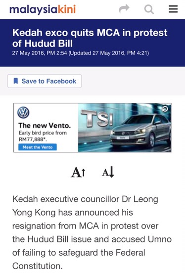 Yesterday afternoon, a Kedah MCA man quit the party citing the failure of the MCA to stop UMNO from supporting the tabling of the Hudud bill in Parliament by PAS President Hadi Awang, and UMNO for failing to safeguard the Federal Constitution.