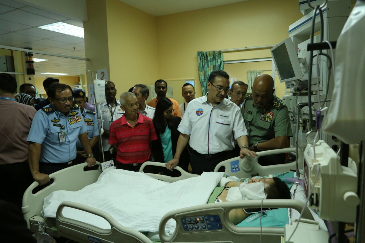 Minister of Defence Datuk Seri Hishammuddin Hussein visiting Captain Wai Lik TUDM at the Seberang Jaya Hospital. He is flanked by the Chief of RMAF General Dato Sri Hj Affendi bin Buang TUDM and Chief of Defence Forces General Tan Sri Raja Mohamed Affandi bin Raja Mohamed Noor. Captain Wai Lik’s father is in red.