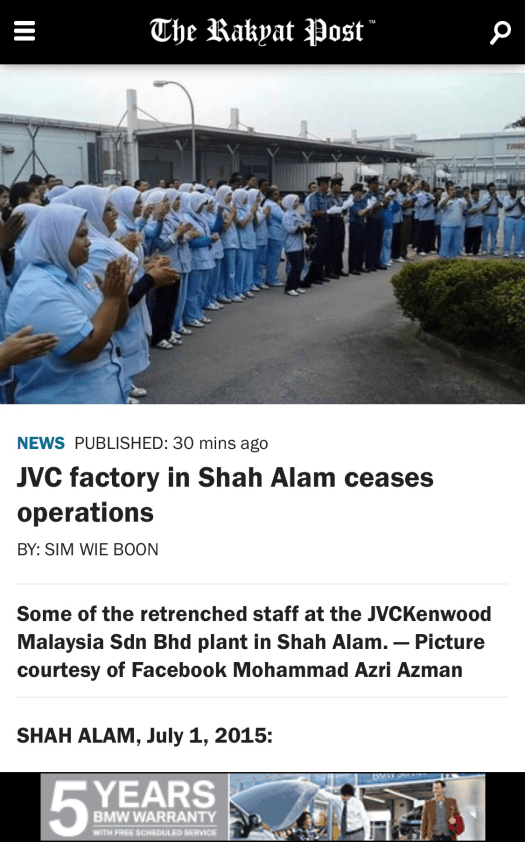 It is a Ramadan and a bleak Syawal for the former workers of JVC Kenwood at Section 22 Shah Alam as the factory ceases its operations as reported by The Rakyat Post above. I am sure the decision to cease operations must have been made much earlier than just a few months or a year ago as any plant closure affects production as well as support services.