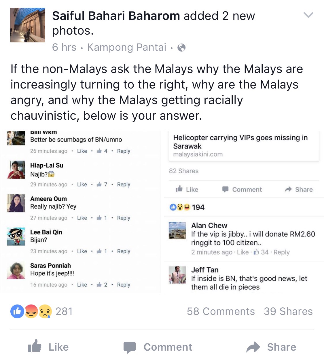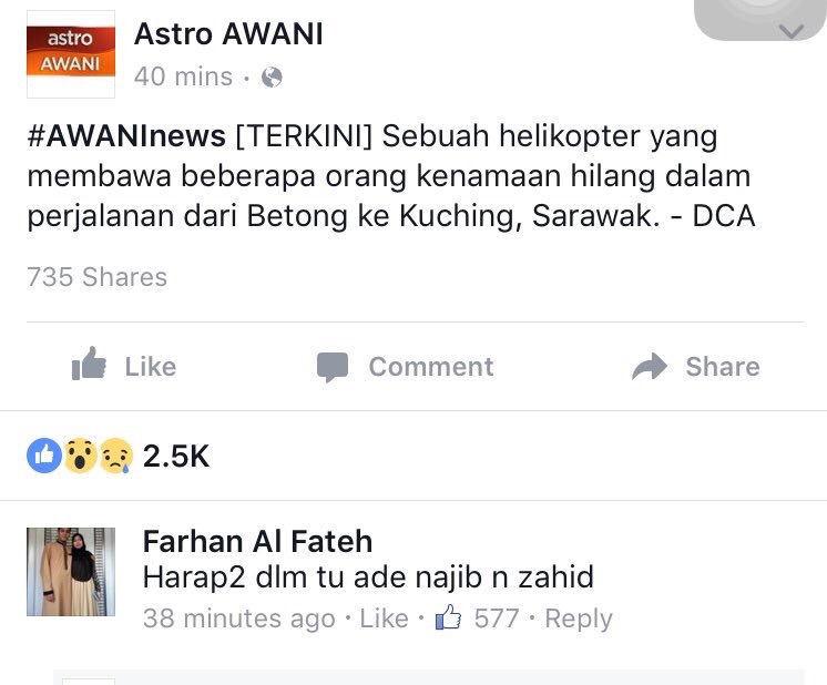 The Barisan Nasional lost one Member of Parliament, Datuk Noriah Kasnon, and possibly another, in a helicopter accident on Thursday evening. Every time Malaysia loses an aircraft, ugly cretins especially from the Peninsular rear their head on social media. Let us see this as an example: