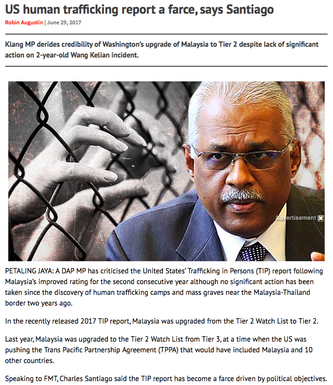 Not all are thankful that the efforts made by the government, notably Klang MP Charles Santiago who calls the US State Department’s TIP report a ‘farce‘ that is ‘driven by political objectives.’