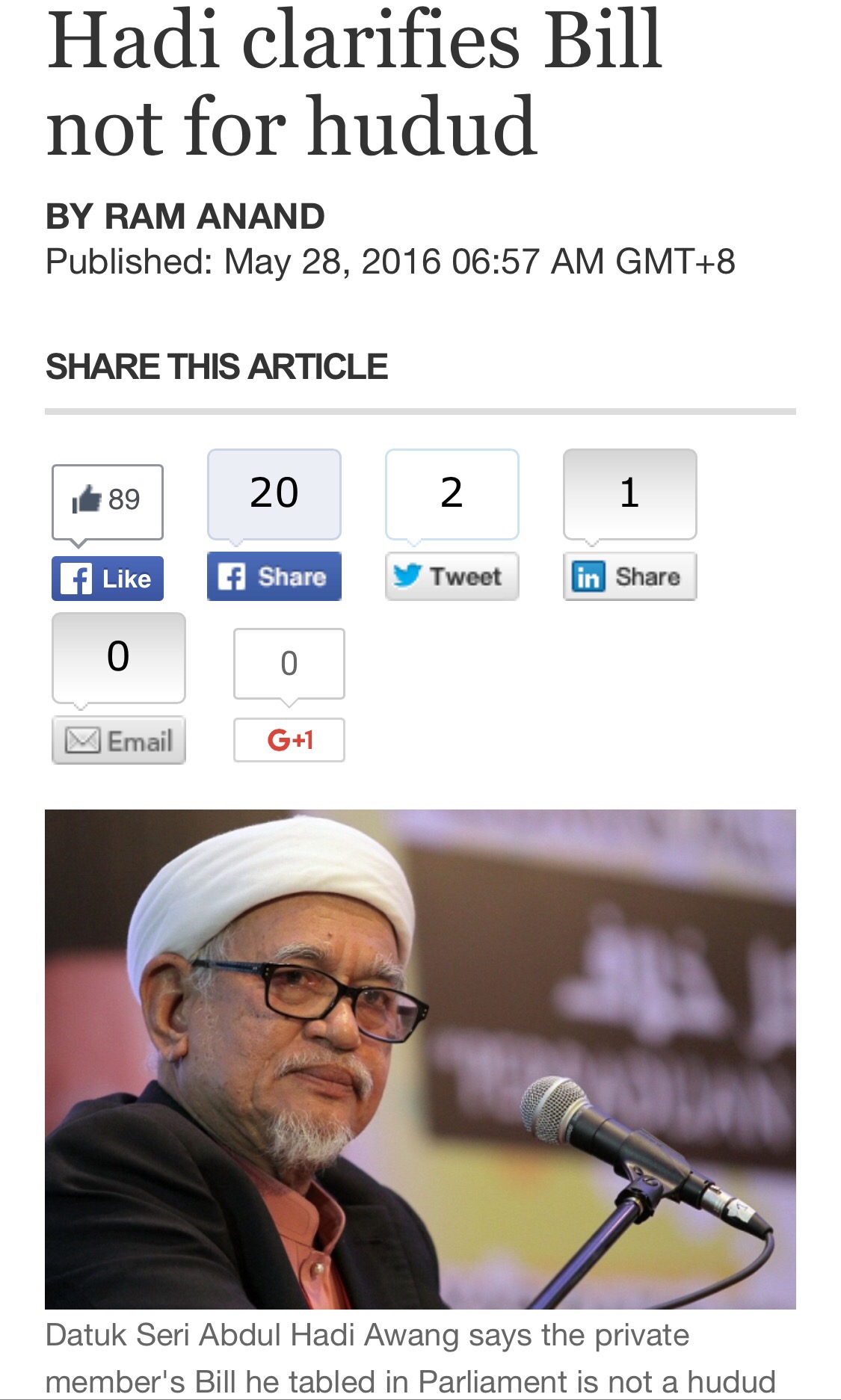 I wrote on Saturday how silly it is for people to go berserk over the private bill by Abd Hadi Awang of PAS seeking to enhance the Syariah Court (Criminal Jurisdiction) Act, 1965.