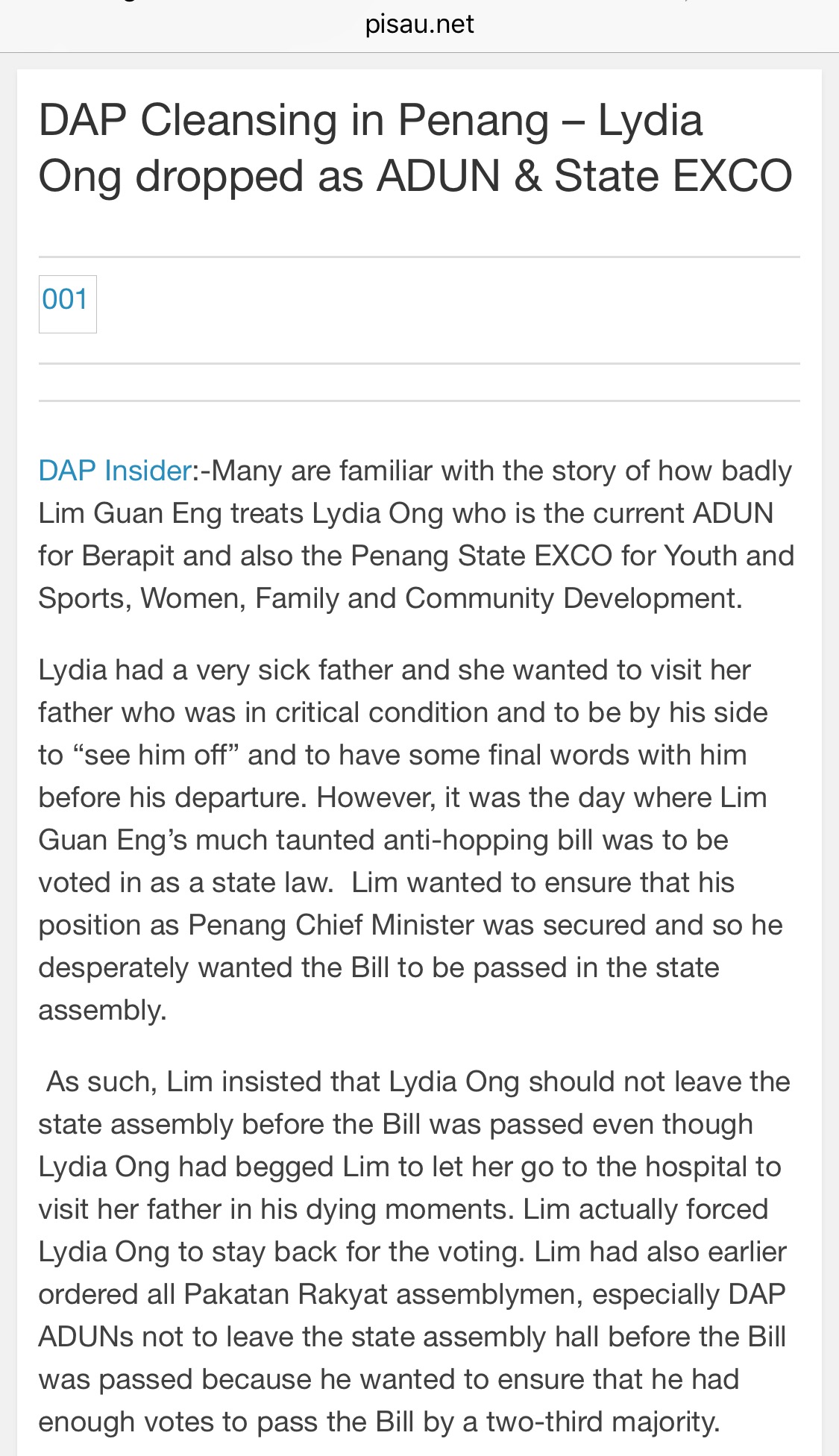 There were other illegal things that the DAP had done since then including removing the Kedah State DAP Committee headed by Lee Guan Aik in May 2013 and replacing them with members of the Lim’s choice including Zairil Ross Lim as the State’s committee interim Chairman.