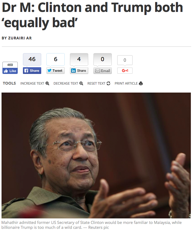 We have stepped into an era that will be filled with surprises and not less scarily challenging. The only consolation is that George Soros who finances both the Hillary campaign machinery as well as the Opposition and pro-Opposition organisations in Malaysia will find it hard to thrive. Perhaps as a gesture of goodwill Trump should look into the affairs of the Open Society Institute and how its financing of the Arab Spring has given rise to the terrorist activities in North Africa, the Middle East as well as in South East Asia and take criminal action against the OSI.