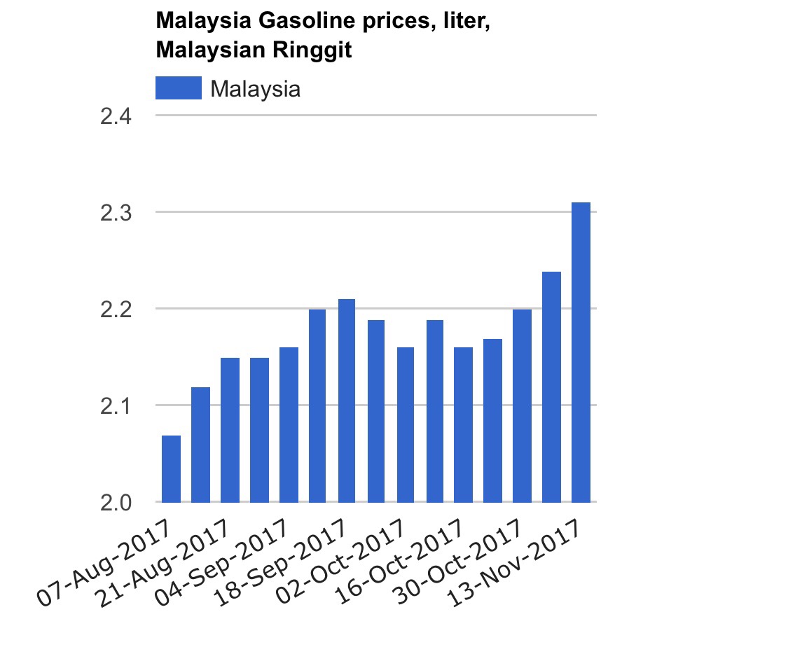 Taking the last three months (from 7 August 2017 until 13 November 2017), the average price of fuel in Malaysia was around RM2.18 per litre with the lowest being RM2.07 per litre on 7 August 2017 and highest at RM2.31 per litre on 13 November 2017.