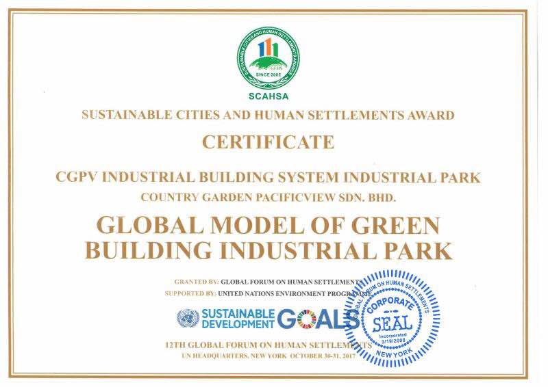 On the 31st October 2017, Forest City won the Global Model of Green Building Industrial Park for the second consecutive year. The award was part of the Sustainable Cities and Human Settlements Award (SCAHSA) ceremony held in New York.