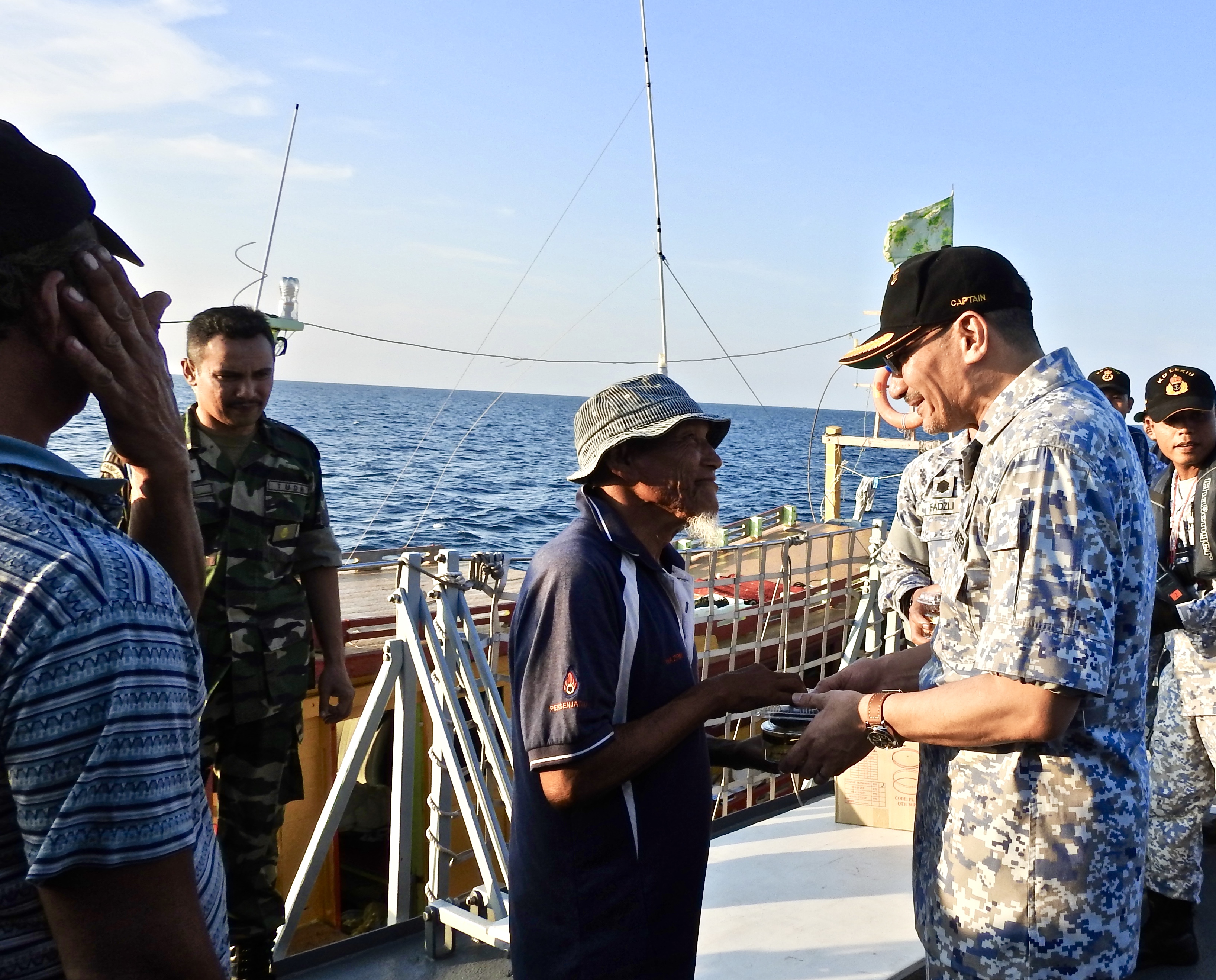 Encik Ramli bin Isa and Fauzi bin Omar had been out at sea for four days with another crew member. The moment they realised that it was the Minister himself whom had helped them up, their face lit up. The Minister, General Raja Mohamed Affandi and Admiral Ahmad Kamarulzaman asked them how they were and if they find that the waters are safe from foreign elements.