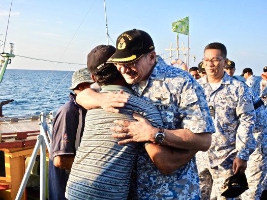 Through the Royal Malaysian Navy’s “Rakan Maritim” (RAKAM) program where the maritime community especially the commercial fishermen work hand-in-hand with the Navy to provide information especially on crime at sea, the fishing community has been providing such support especially through the “Initiatif Bertanya Khabar” (IBK) conducted by the individual naval vessels that are on patrol. A fishing trawler that was hailed came alongside.
