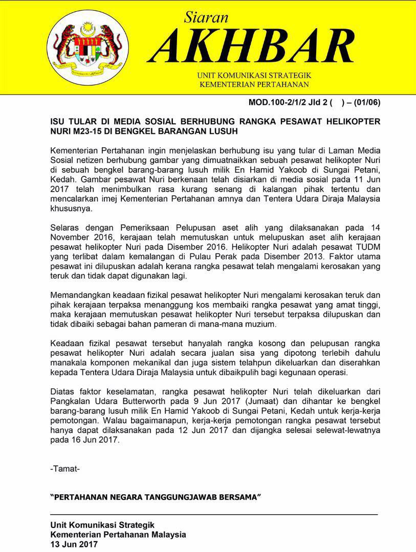 Kenyataan Kementerian Pertahanan berhubung isu pelupusan sebuah pesawat Nuri