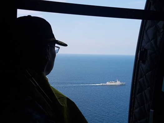 Hishammuddin looking at the KD Lekiu before landing (taken from the Minister’s Twitter)
