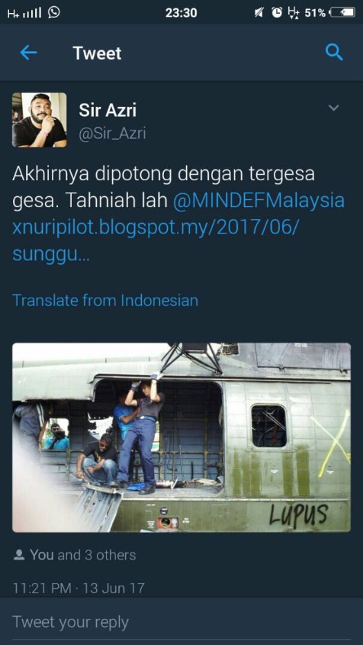 Peristiwa ketiga ialah peristiwa pelupusan sebuah pesawat Sikorsky S-61A4 Nuri yang telah menjadi buah mulut ramai sehingga ada yang sanggup merosakkan imej Angkatan Tentera Malaysia dan Kementerian Pertahanan.