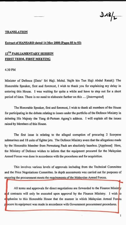 Najib Razak’s reply to Wan Azizah on the Scorpene issue in 2008In 2008, then Deputy Prime Minister and Minister of Defence, in his reply to Wan Azizah confirmed that all terms and approvals of the procurements of the two units of Scorpene submarines and 18 units of fighter jets were made in accordance with Government procurement procedures and could only be executed by the Finance Ministry.